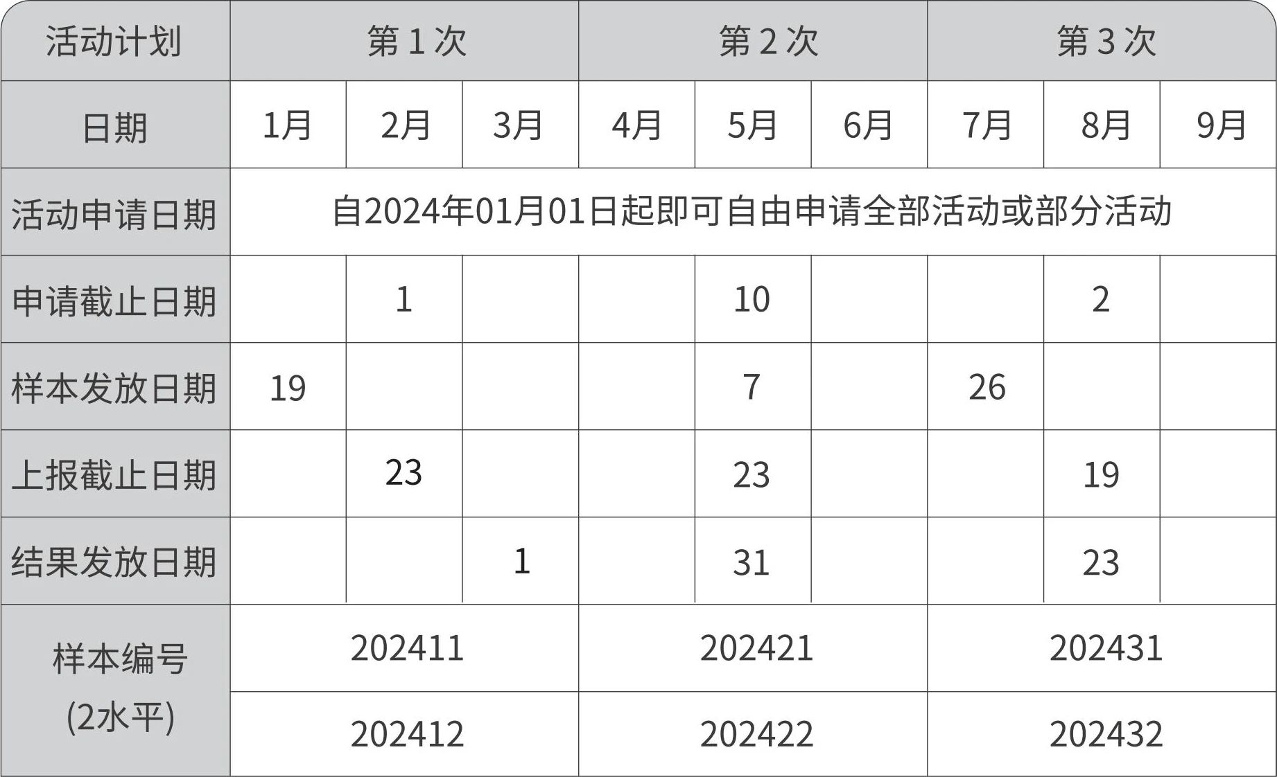 2024年九強(qiáng)生物質(zhì)量評(píng)價(jià)計(jì)劃全年開(kāi)展3次,每項(xiàng)活動(dòng)每次發(fā)放2個(gè)濃度水平樣本各1支。開(kāi)展的活動(dòng)及項(xiàng)目具體如下: